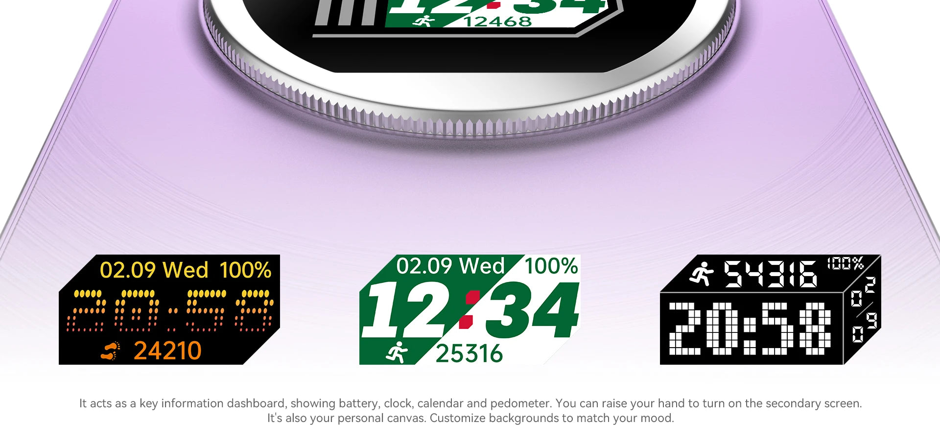 Он действует как ключевая информационная панель, показывающая батарею, часы, календарь и шагомер. Вы можете поднять руку, чтобы включить дополнительный экран.