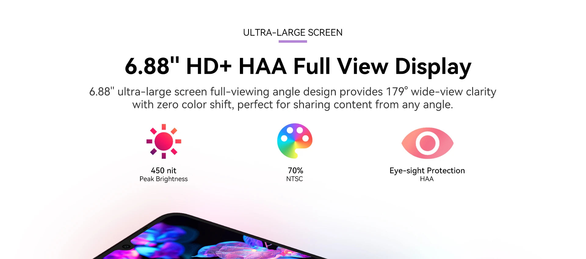 Дисплей: 6,88-дюймовый HD+ HAA-дисплей