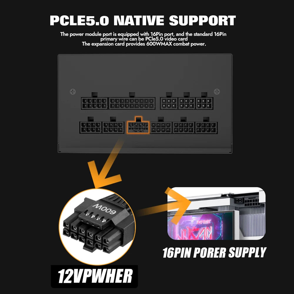 4. «Собственный кабель 12 В HPWR» может генерировать до 600 Вт питания для видеокарт PCIe 5.0, структура DC-DC, поддержка резонанса Full Bridge LLC, синхронное выпрямление 12 В обеспечивают стабильный и безопасный выход.