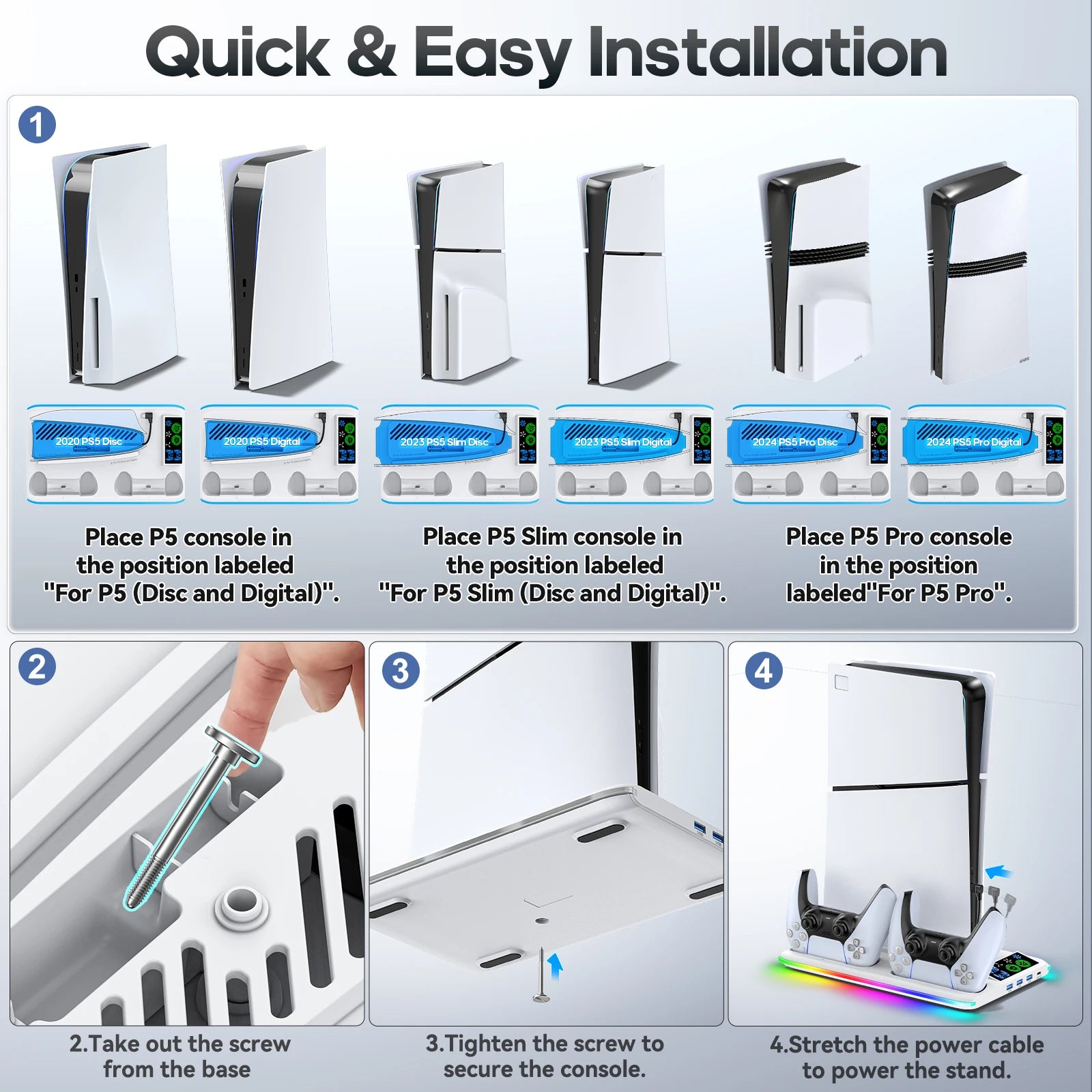 Подставка для PS5/PS5 Slim/PS5 Pro с креплением для наушников, охлаждающая подставка и зарядная станция д...