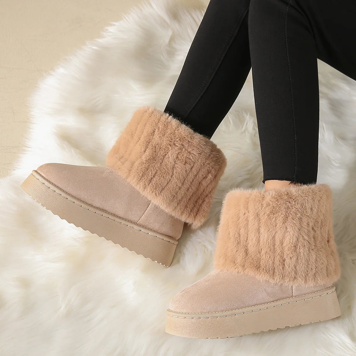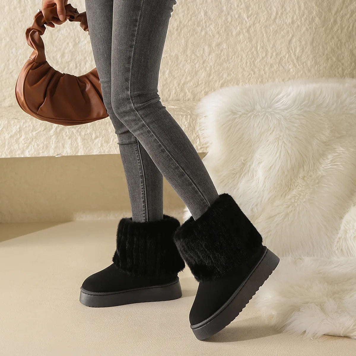 Женские зимние ботинки, черные, с круглым носком, из плотного плюша, теплые, на среднем каблуке, водонепр...