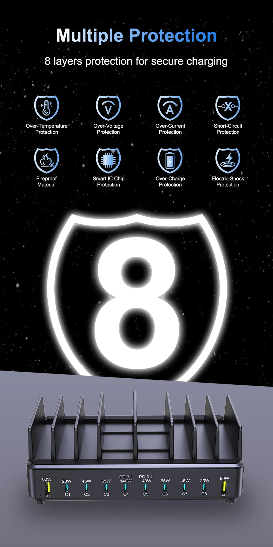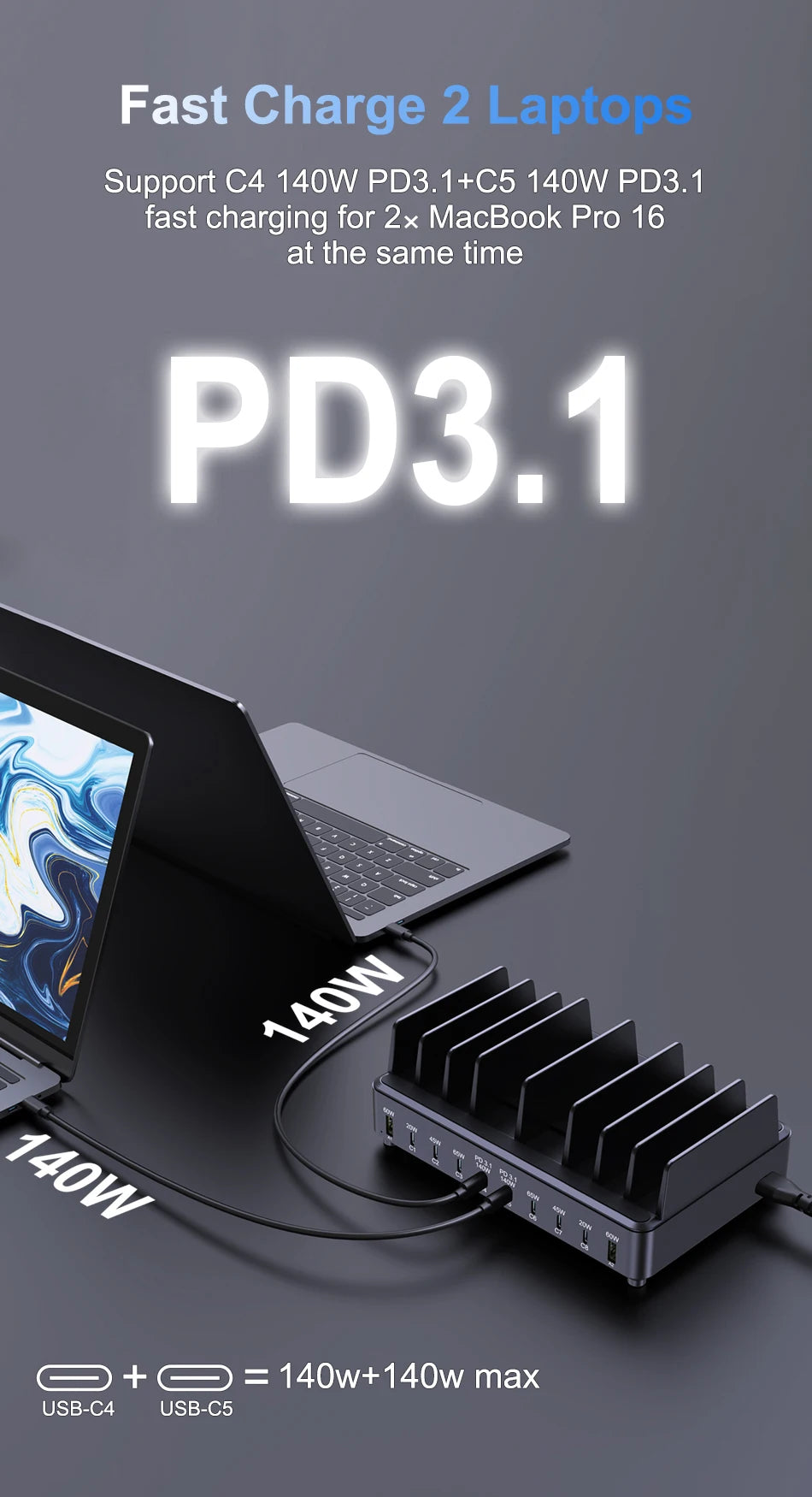 Поддержка быстрой зарядки C4 140W PD3.1 + C5 140W PD3.1 для двух MacBook Pro 16 одновременно.