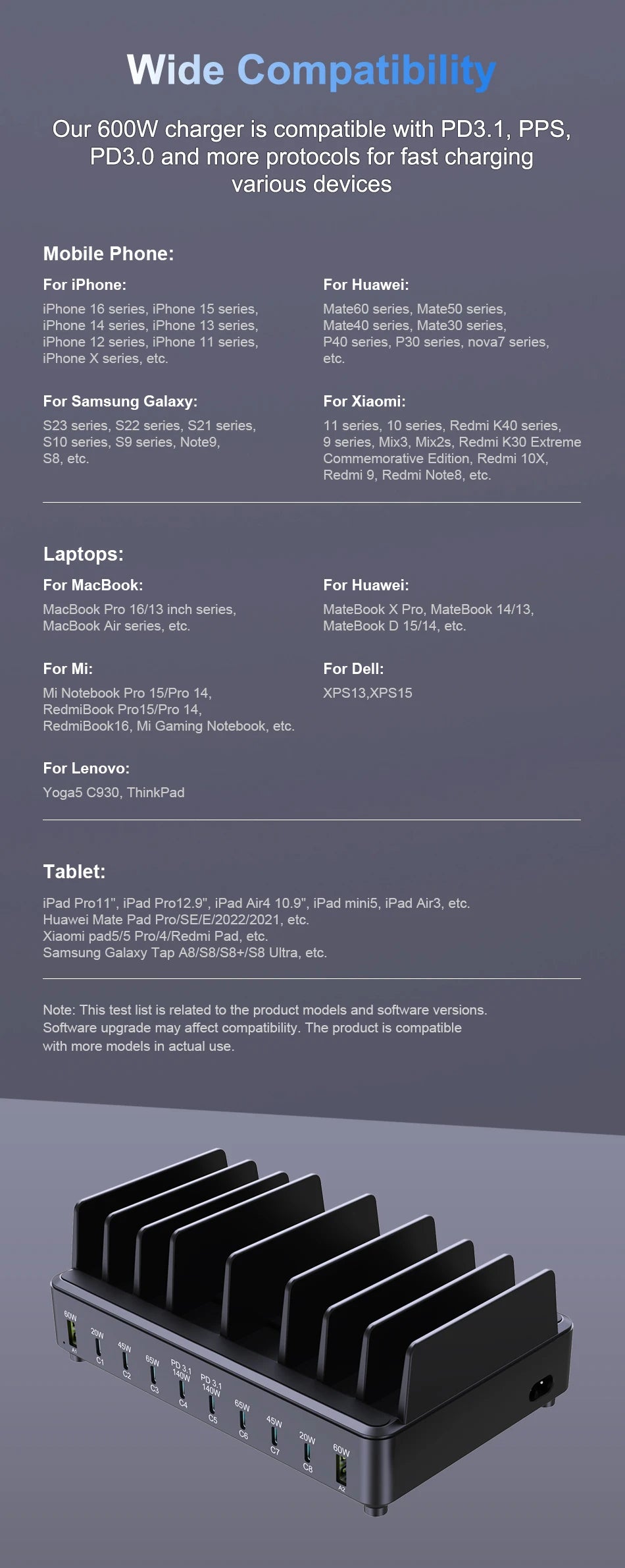 Наше зарядное устройство мощностью 600 Вт совместимо с протоколами PD3.1, PPS, PD3.0 и другими для быстрой зарядки различных устройств.