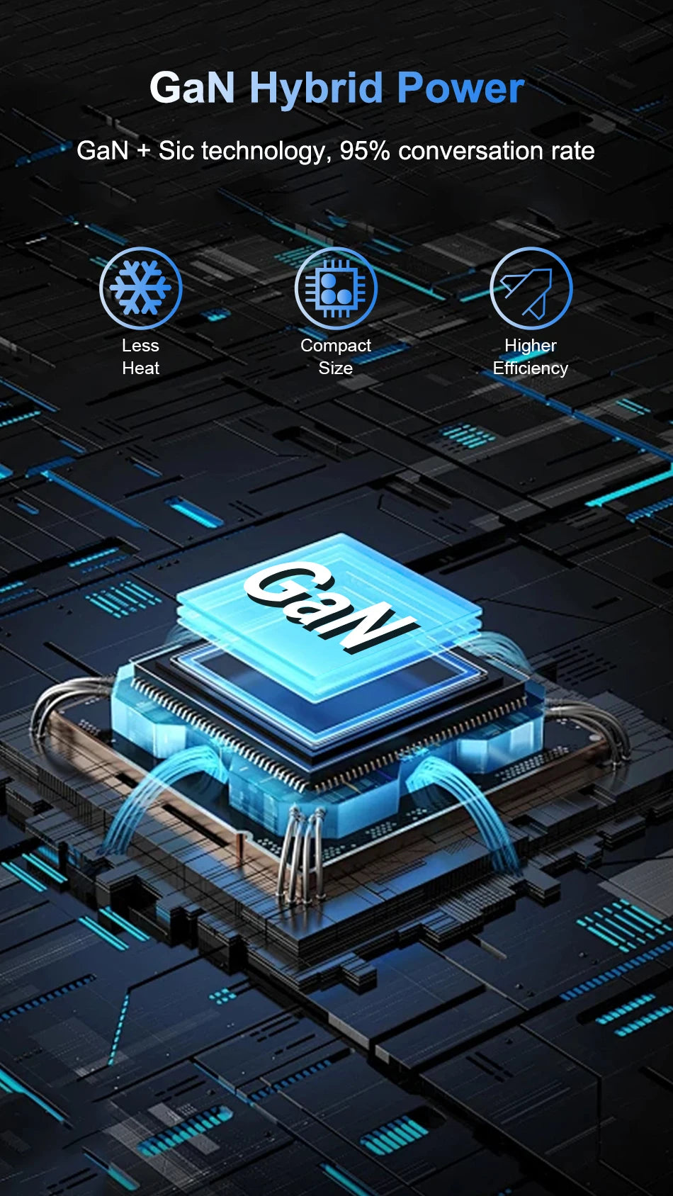 Технология GaN + Sic, коэффициент конверсии 95%.
