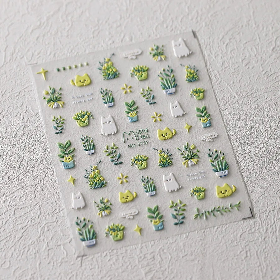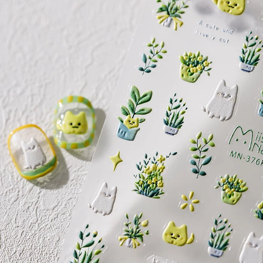 1 шт. Милые кошачьи зеленые цветы в горшках наклейки для ногтей 5D рельефы самоклеящиеся наклейки для дизайна ногтей маникюрные украшения наклейки