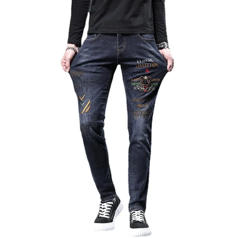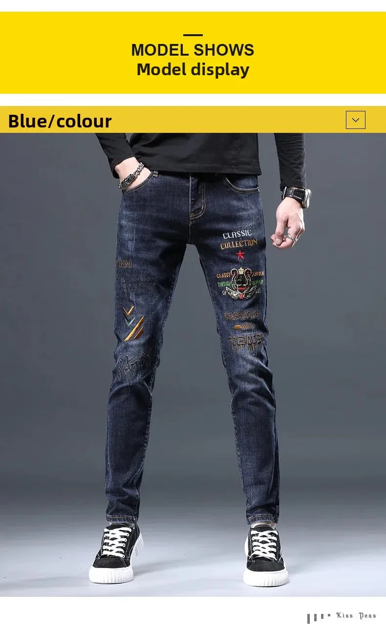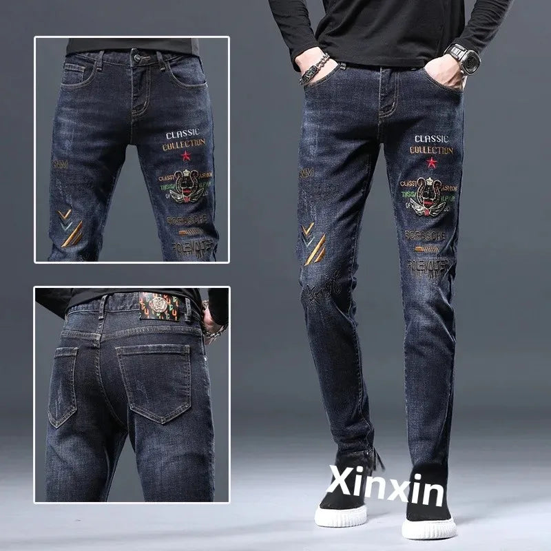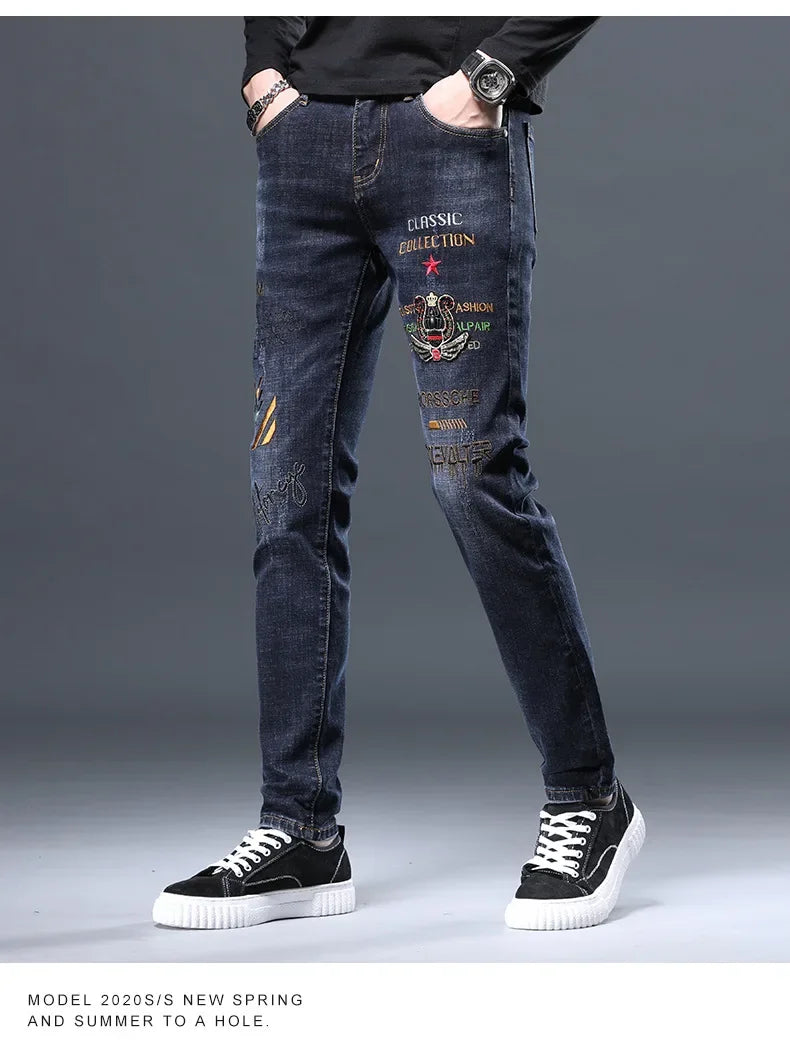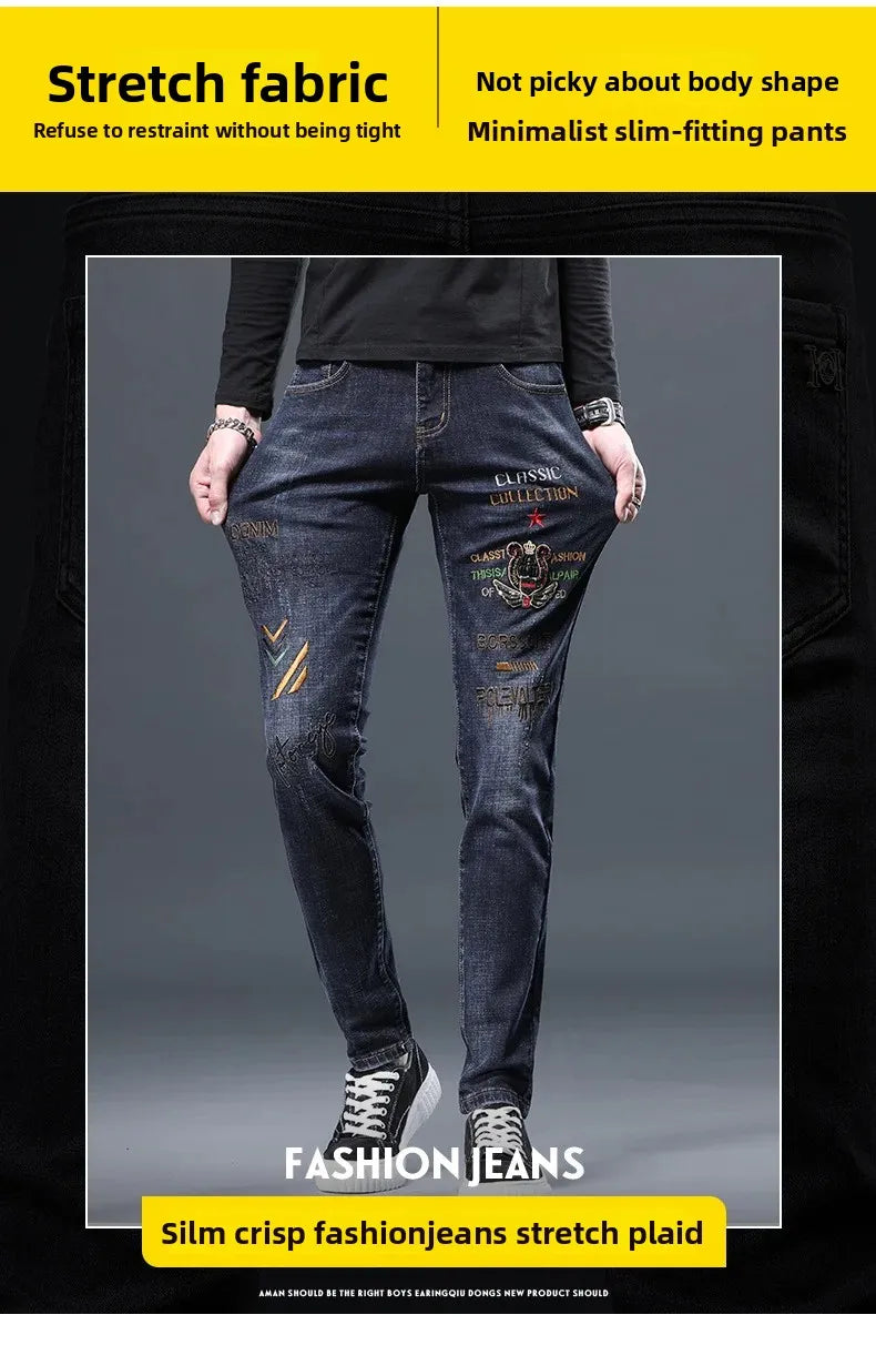 Модные брендовые мужские облегающие джинсы весна-осень с вышитым принтом, эла...