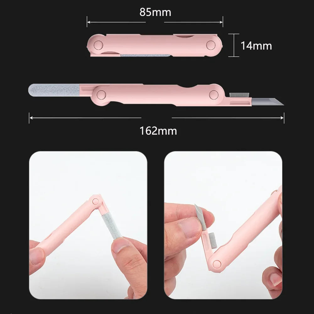 2. 【Складная двухголовая чистящая ручка】Съемная двухголовая конструкция отлично справляется со своей задачей. Силиконовый наконечник может удалять пятна из щелей и стойкие остатки, небольшая щеточка с тонкой щетиной используется для очистки пыли в сетке или небольших отверстиях, не повреждая выход звука, а ворсистая губка может легко очистить зарядный чехол Airpod.