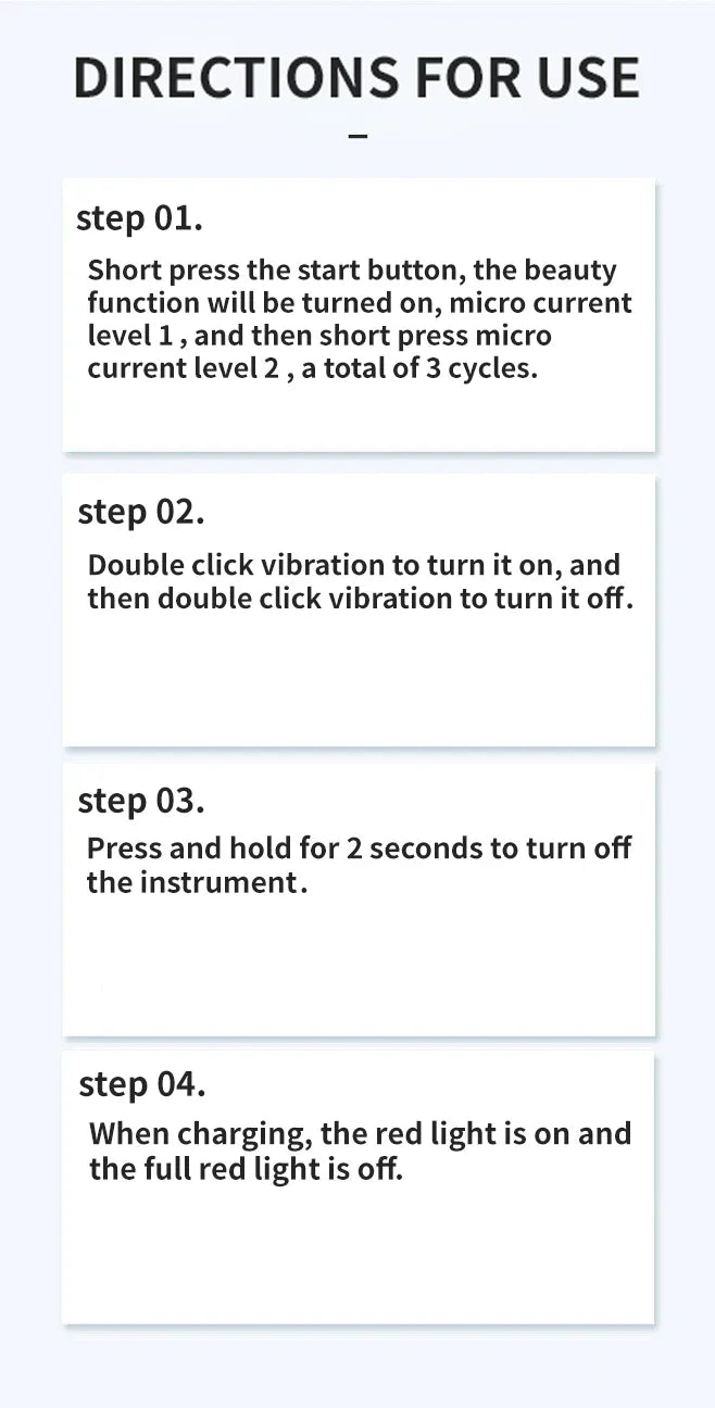 Применение : 1. Кратковременно нажмите кнопку питания, чтобы включить функцию красоты с первым уровнем микротока, а затем коротко нажмите кнопку питания, чтобы включить второй уровень микротока, в общей сложности три цикла.