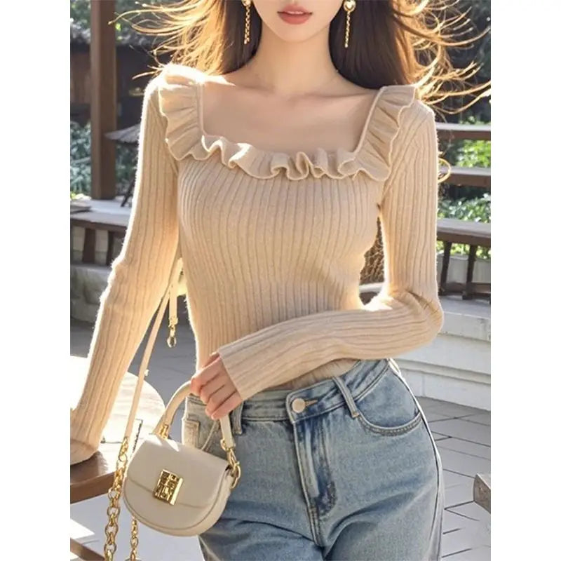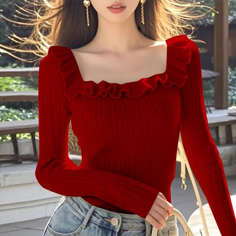 Женская одежда Осень Зима Однотонный пуловер с квадратным воротником и винтов...