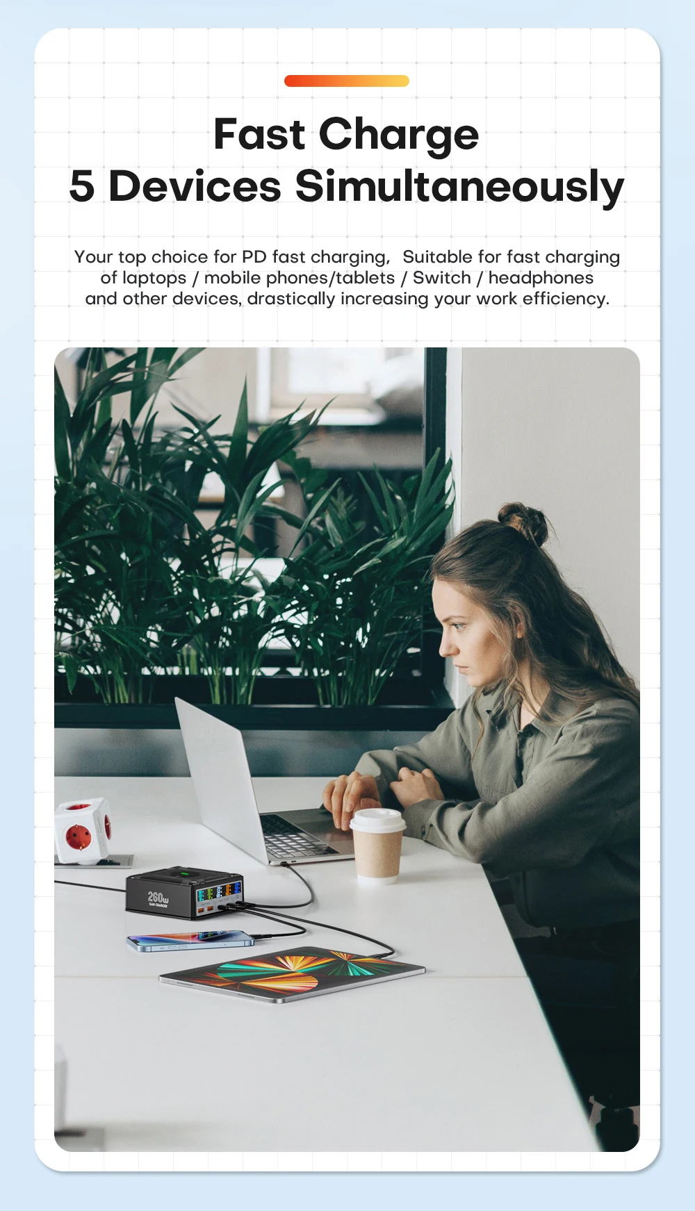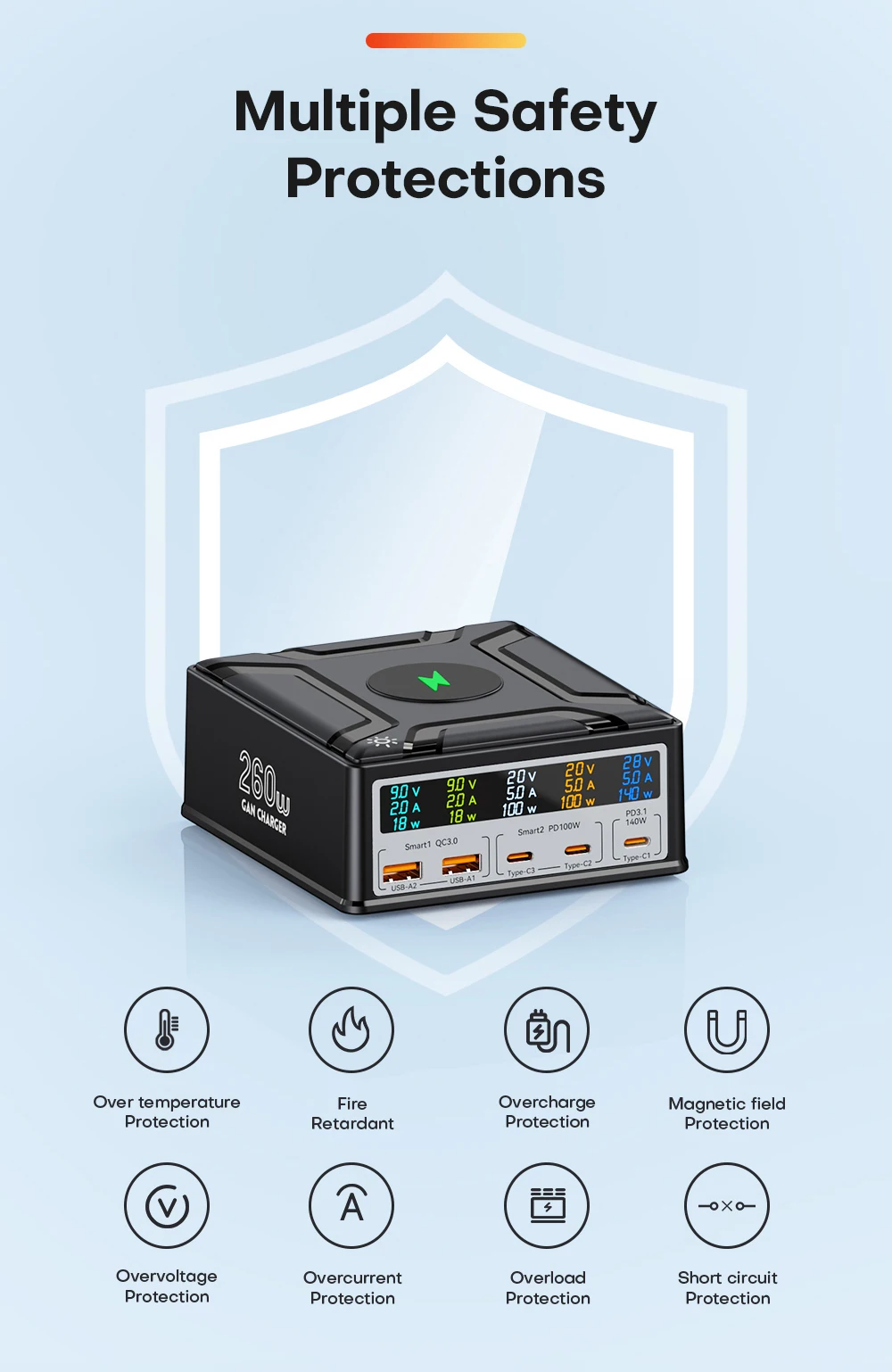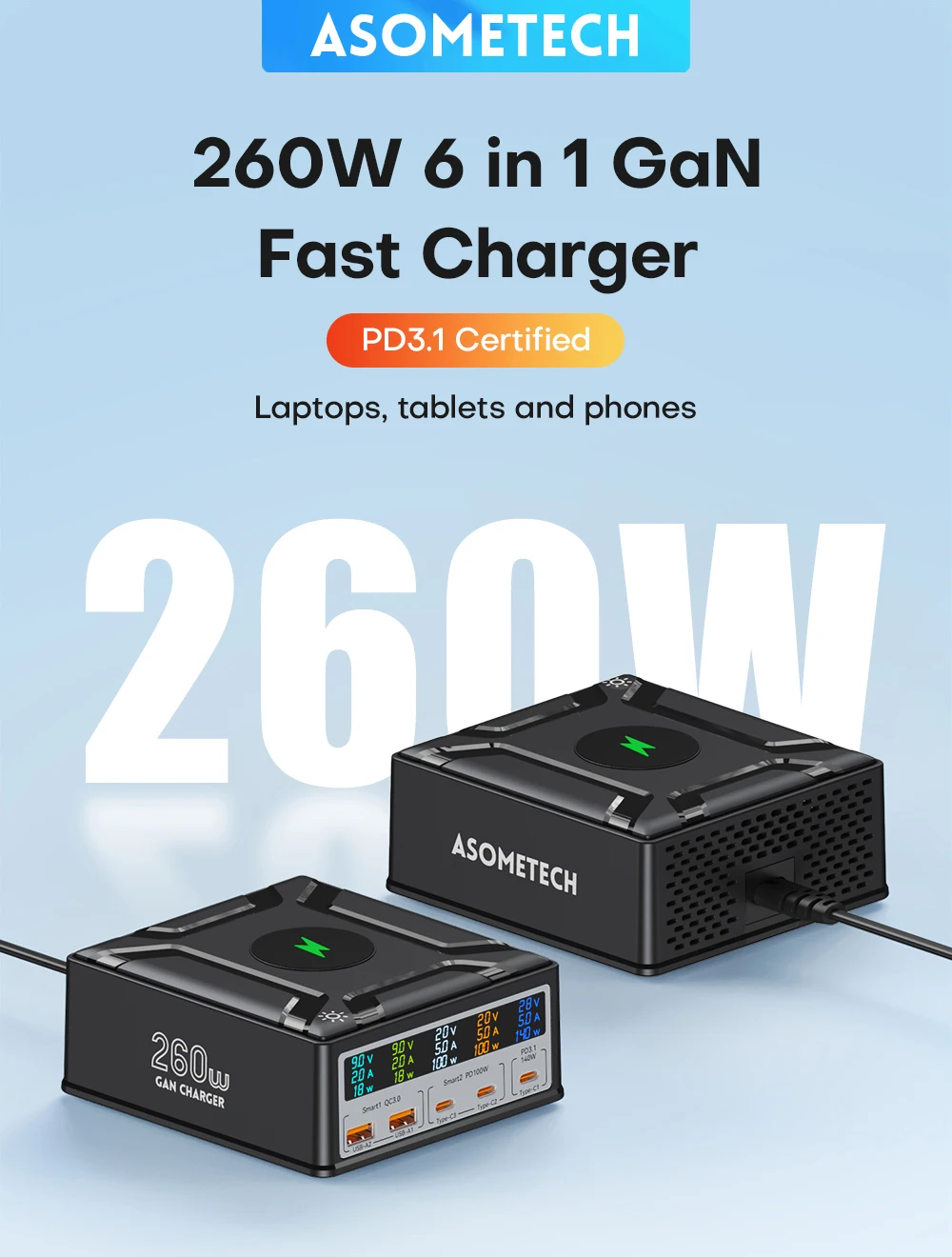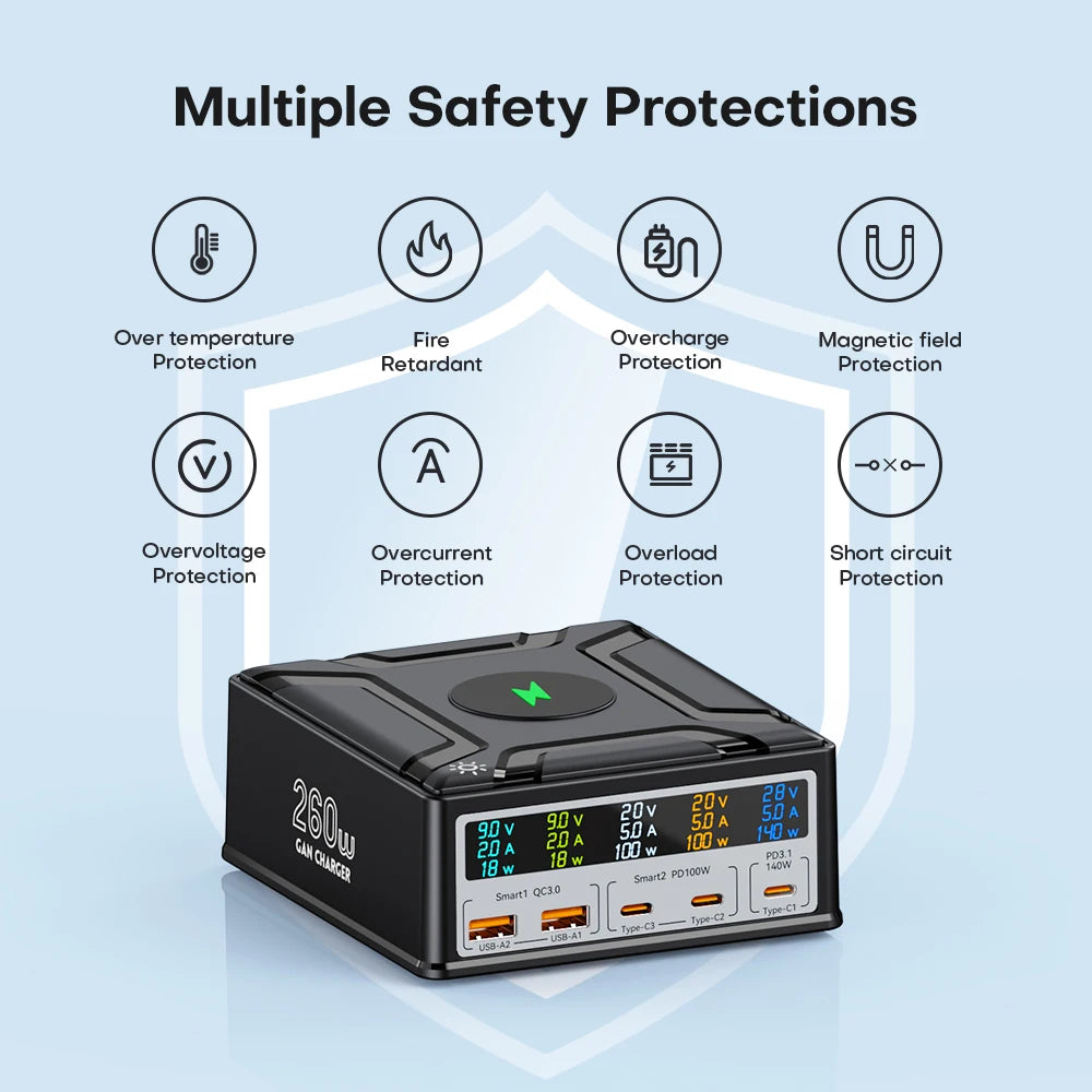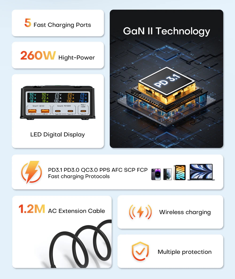 Зарядное устройство GaN USB C 260 Вт Pd3.1 140 Вт USB Type C для быстрого зар...