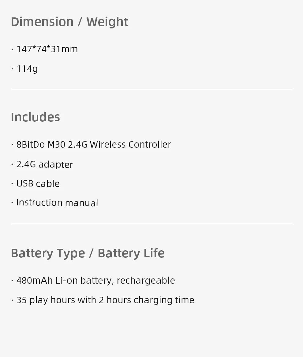 В комплект входят : контроллер M30 2.4G, беспроводной приемник 2.4G, USB-кабель.
