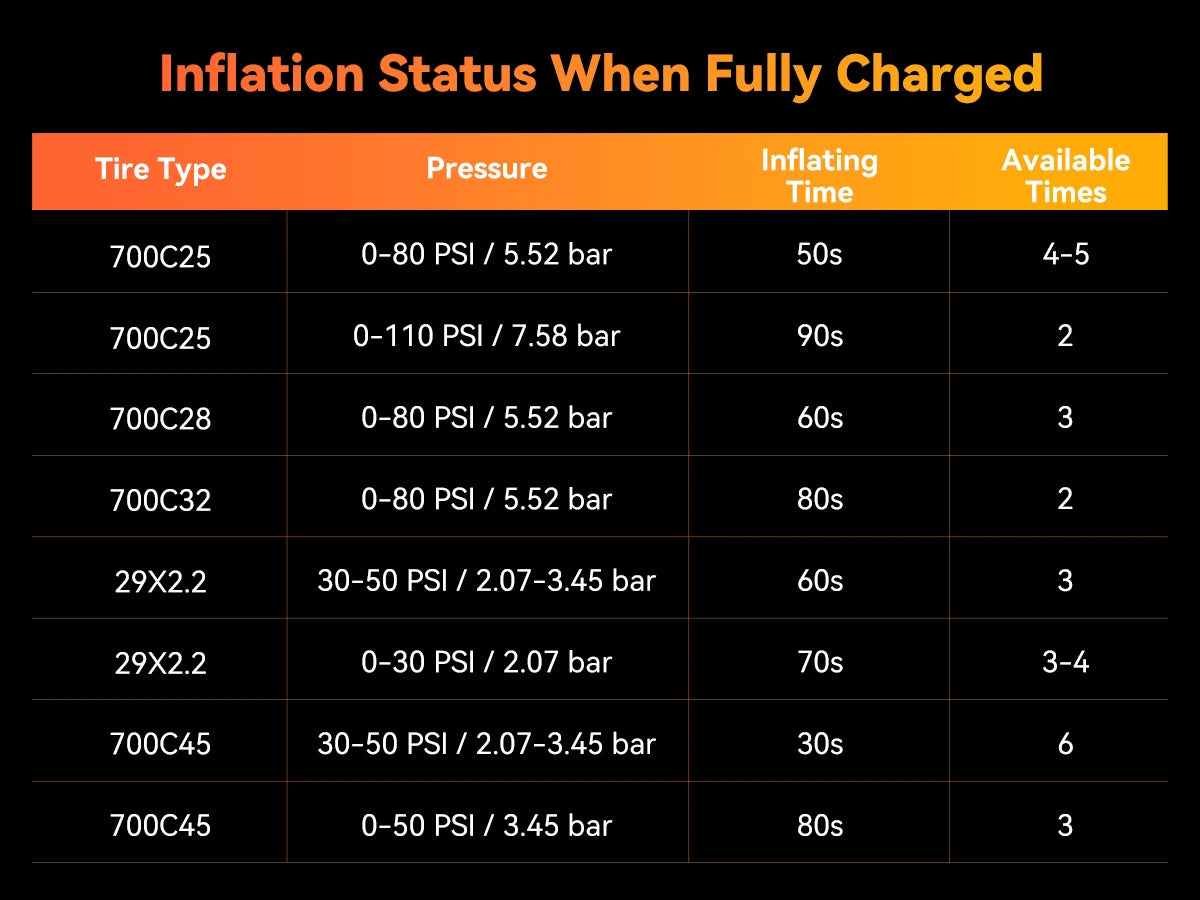 Не нужно долго ждать, вы можете накачать стандартную шину шоссейного велосипеда от 0 до 120 фунтов на кв. дюйм за 120 секунд, и процесс автоматически остановится после завершения накачивания.