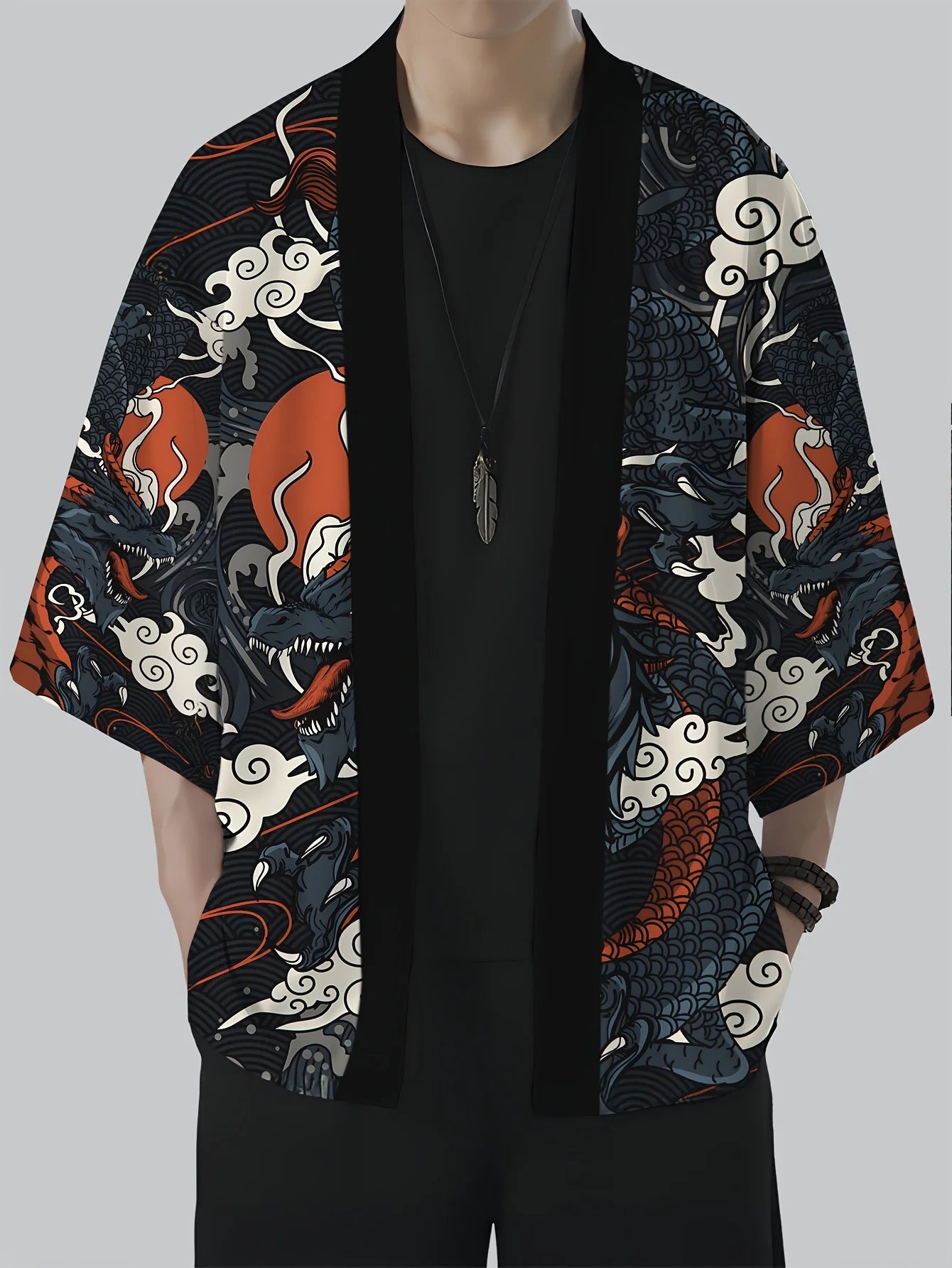 Мужское кимоно свободного кроя с винтажным принтом дракона, повседневное, лет...