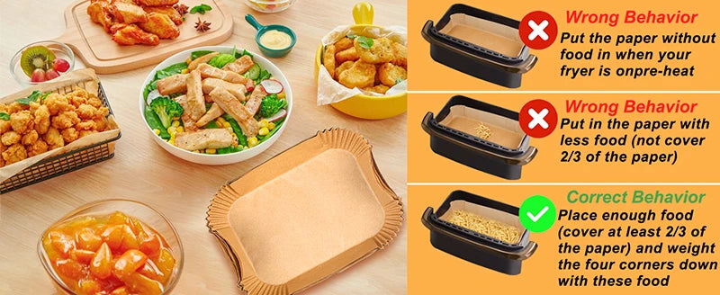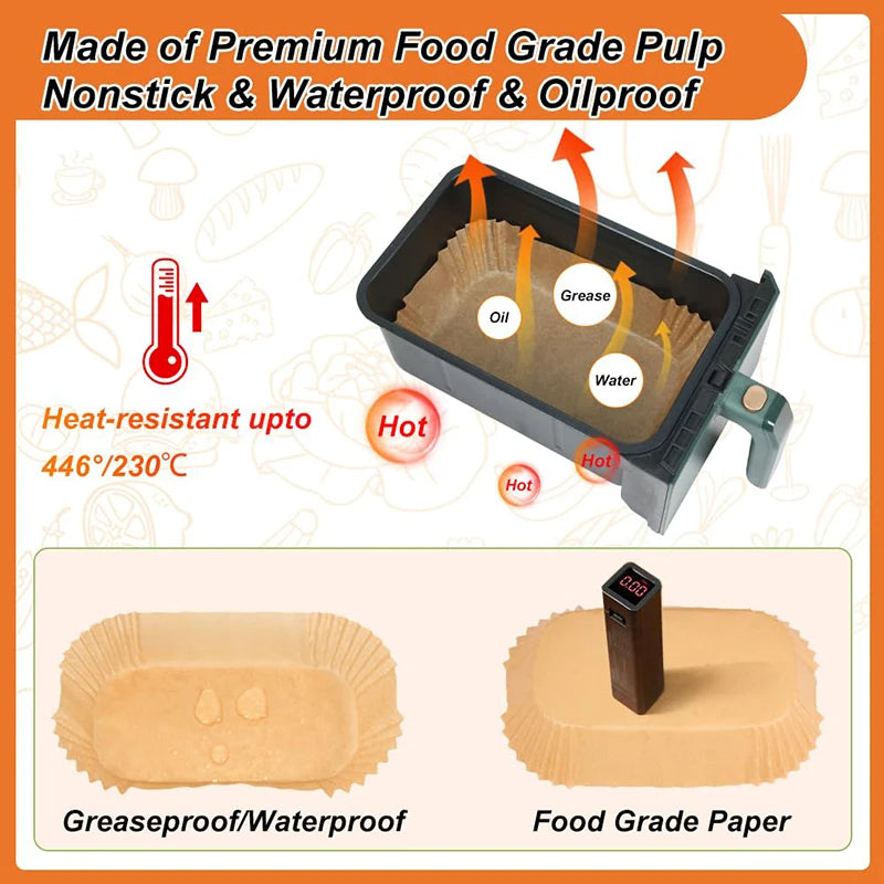 ✅【Пищевые бумажные вкладыши для аэрофритюрниц】Наши пергаментные бумажные вкладыши для аэрофритюрниц изготовлены из пищевой древесной массы и покрыты пищевым силиконовым маслом, без флуоресценции, без BPA. Высокая термостойкость до 428 градусов по Фаренгейту. Эти антипригарные жиростойкие пергаментные бумажные вкладыши для аэрофритюрниц безопасны для ежедневного использования, не влияют на вкус пищи и циркуляцию горячего воздуха при жарке на воздухе.